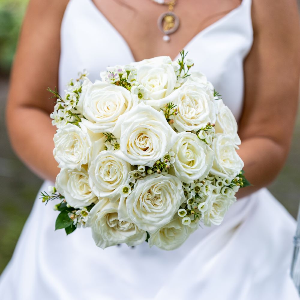 L'élégance dans sa pure simplicité. Des roses ivoires entourées de feuillage verdoyant. Un bouquet rond pour exprimer un amour éternel.